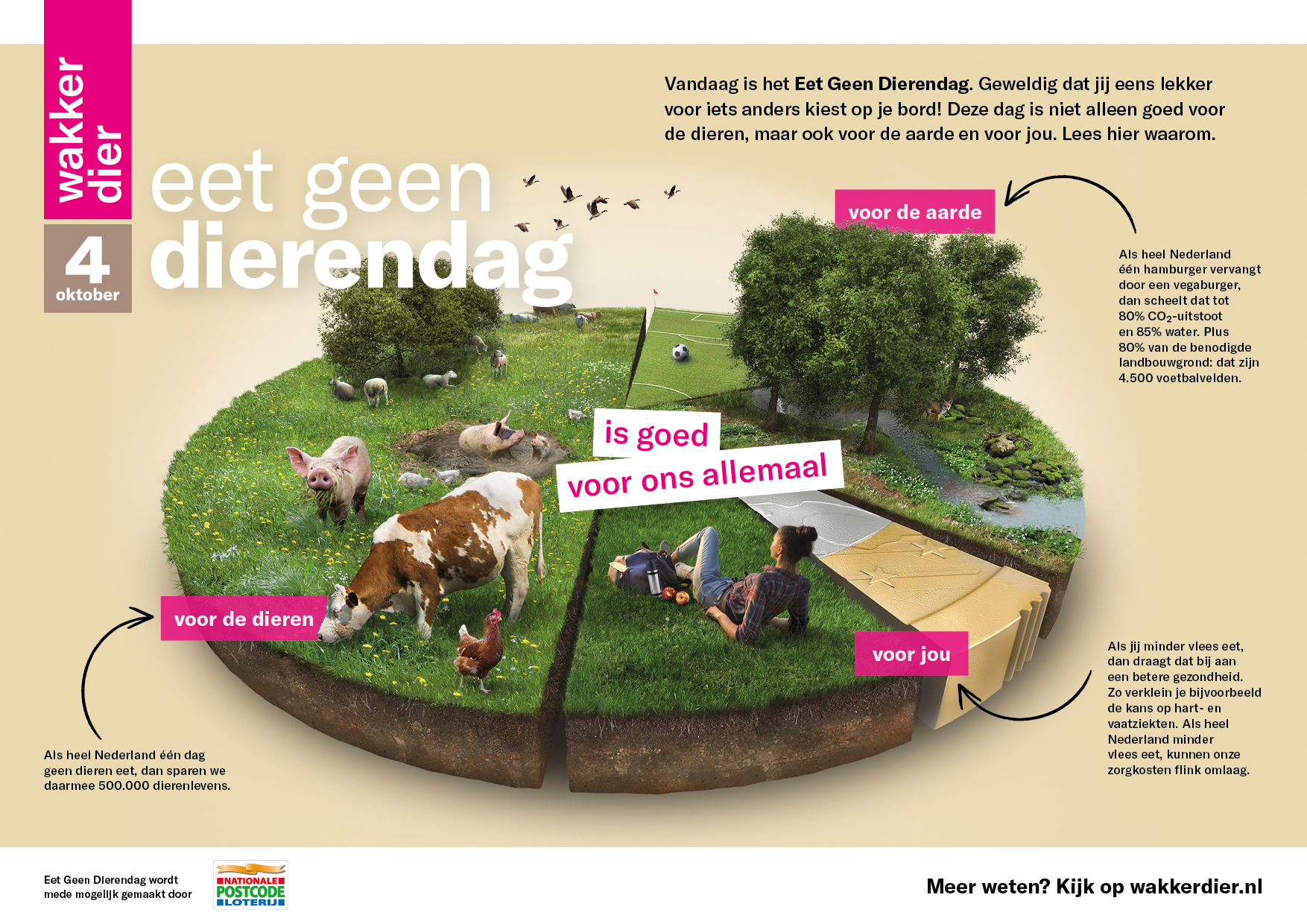 Voor Wakker Dier is een visual ontwikkeld die tevens als placemat werd uitgebracht ter gelegenheid van ‘Eet Geen Dierendag’.