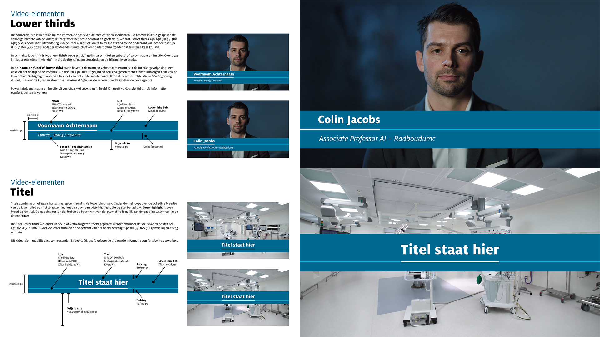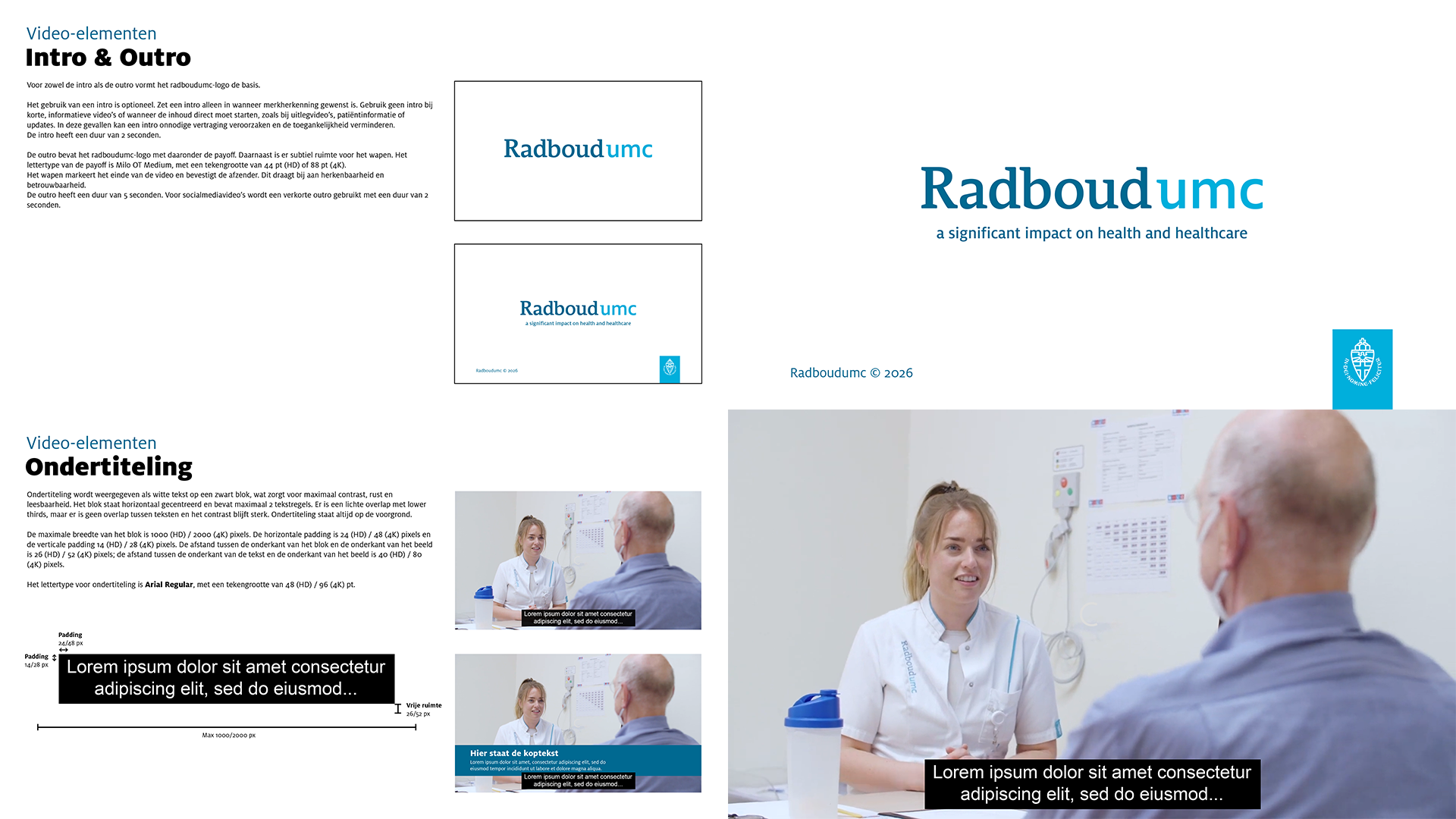 Voor het Radboudumc is een complete video-huisstijl ontwikkeld. Het doel was een uniforme set video-elementen te creëren die intern en extern gebruikt kan worden, en die herkenbaarheid, toegankelijkheid en consistentie garanderen binnen alle videoproducties.